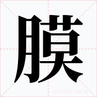 “膜” 字共有 14 画,拼音:mó,注音:ㄇㄛˊ,部首:月,笔画数:14 画,字体结构:左右结构,五行:水,五笔:EAJD,Unicode编码:U+819C,郑码:QEKG,仓颉:BTAK,“膜”字笔顺为:ノフ一一一丨丨丨フ一一一ノ丶