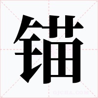 (形声。从金,苗声。本义:船停泊时所用的设备。一般为铁制或钢制)同本义〖anchor〗。如:锚具(船首两侧各有艏锚一具,另有备有锚、流锚及小型锚等);锚缆(系锚的粗绳或铁链);锚链孔(艏之两旁各有一小孔,以备起锚时将锚链由此孔收进,锚则紧贴于外之钢板上)。又指可以依靠的人或物(如在危急时)。如:我们以它作为系住灵魂的坚固牢靠的锚