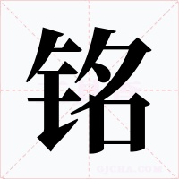 “铭” 字共有 11 画,拼音:míng,注音:ㄇㄧㄥˊ,部首:钅,笔画数:11 画,字体结构:左右结构,五行:金,五笔:QQKG,Unicode编码:U+94ED,郑码:PRJ,仓颉:OPNIR,“铭”字笔顺为:ノ一一一フノフ丶丨フ一