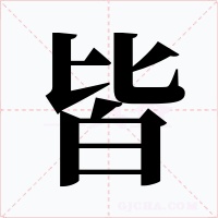 “皆” 字共有 9 画,拼音:jiē,注音:ㄐㄧㄝ,部首:白,笔画数:9 画,字体结构:上下结构,五行:木,五笔:XXRF,Unicode编码:U+7686,郑码:RRRN,仓颉:PPHA,“皆”字笔顺为:一フノフノ丨フ一一