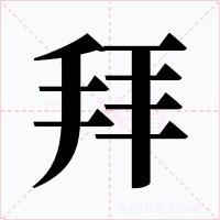 (会意。从两手,从下。《说文》古文上象两手,丅为“下”的古体。《说文》引扬雄说:“拜从两手下。”表示双手作揖,或下拜。隶书将“丅”(下)并入右边的“手”之下而成为“拜”,一直沿用至今。本义:古代表示敬意的一种礼节。两手合于胸前,头低到手)