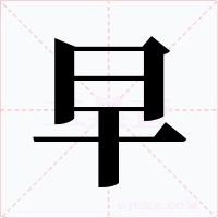 (会意。小篆字形,上面是“日”,下面是“甲”。“甲”的最早写法象“十”,指皮开裂,或东西破裂。“早”即天将破晓,太阳冲破黑暗而裂开涌出之意。本义:早晨)