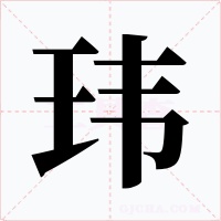 珍奇〖rare;valuable〗。如:玮术(奇特的方术);玮宝(珍奇的宝物);玮环(珍奇,美好);玮博(卓异广博);玮异(奇异);玮奇(奇特,卓异);玮器(杰出的人才);玮艺(卓越的技艺)