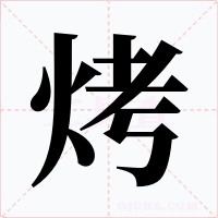 “烤” 字共有 10 画,拼音:kǎo,注音:ㄎㄠˇ,部首:火,笔画数:10 画,字体结构:左右结构,五行:火,五笔:OFTN,Unicode编码:U+70E4,郑码:UOAZ,仓颉:FJKS,“烤”字笔顺为:丶ノノ丶一丨一ノ一フ