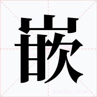 “嵌” 字共有 12 画,拼音:qiàn,注音:ㄑㄧㄢˋ|ㄎㄢˋ,部首:山,笔画数:12 画,字体结构:上下结构,五行:木,五笔:MAFW,Unicode编码:U+5D4C,郑码:LLER,仓颉:UTMO,“嵌”字笔顺为:丨フ丨一丨丨一一ノフノ丶