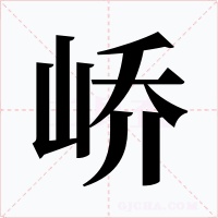 “峤” 字共有 9 画,拼音:jiào,qiáo,注音:ㄐㄧㄠˋ|ㄑㄧㄠˊ,部首:山,笔画数:9 画,字体结构:左右结构,五行:土,五笔:MTDJ,Unicode编码:U+5CE4,郑码:LLGN,仓颉:UHKL,“峤”字笔顺为:丨フ丨ノ一ノ丶ノ丨