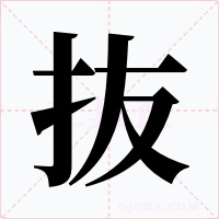 “抜” 字共有 7 画,拼音:bɑ,注音:ㄅㄚˊ,部首:扌,笔画数:7 画,字体结构:左右结构,五行:水,五笔:RDCY,Unicode编码:U+629C,郑码:DGXS,仓颉:QKE,“抜”字笔顺为:一丨一一ノフ丶