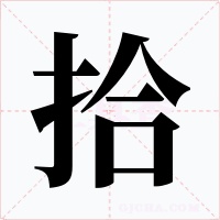 又如:拾粪;拾麦穗儿;拾毛(拣界外球。毛:用毛充塞内部的球);拾芥(拾取地上的小草。比喻取之极易);拾石为砚(从地上拾起一块石头用作砚台);拾夺(拾掇;收拾);拾拣(拣取);拾翠(拾取翠鸟羽毛以为首饰);拾沈(拾取汁水)